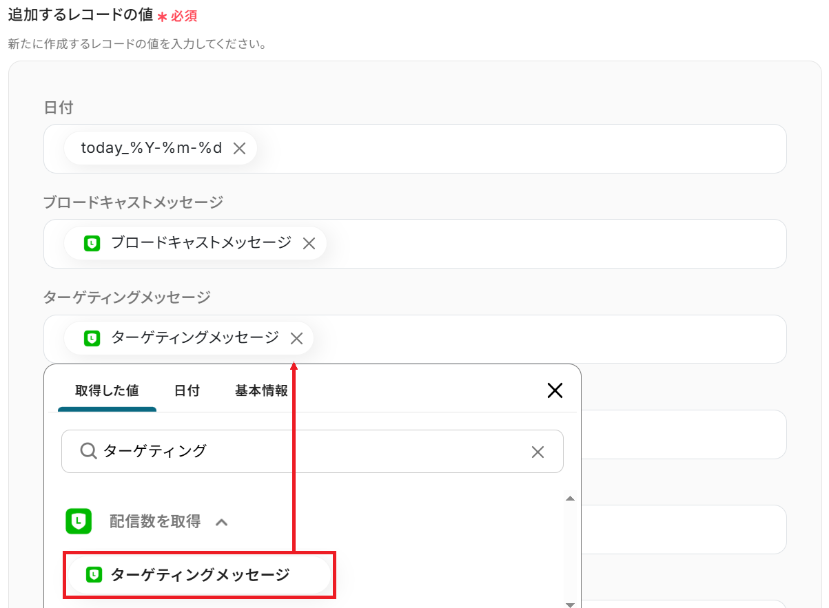 あとは先ほど用意したシートのヘッダーに対応する項目を選択しましょう。 以下のようにLINE公式アカウントから取得した値や日付の変数を選択すると、トリガーが実行されるたびに最新の情報を反映できます。