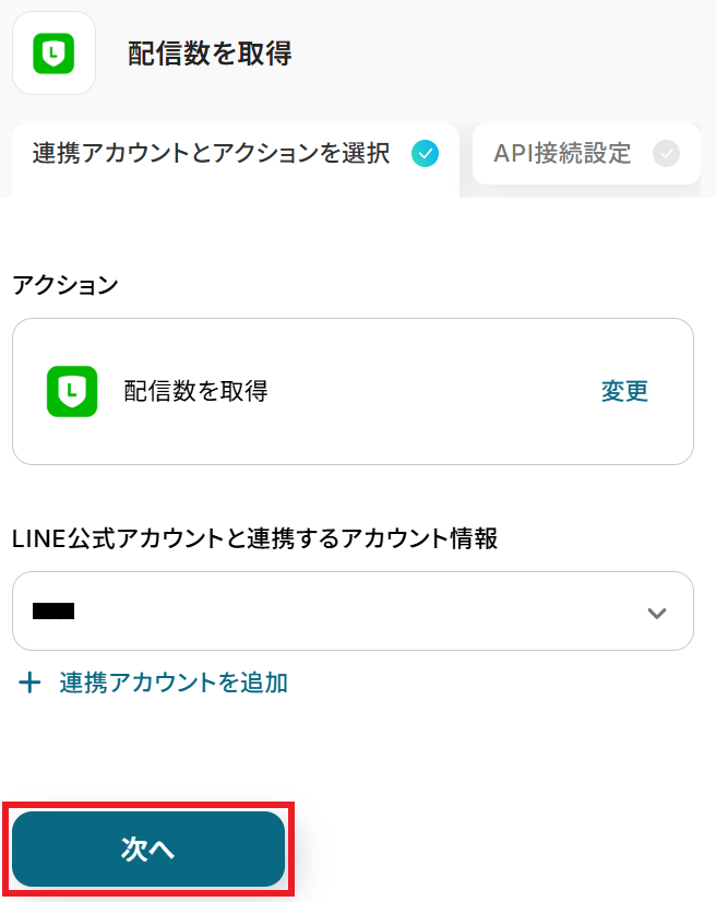 タイトルと連携するアカウント情報を任意で設定し、アクションはテンプレート通りに「配信数を取得」のまま「次へ」をクリックします。