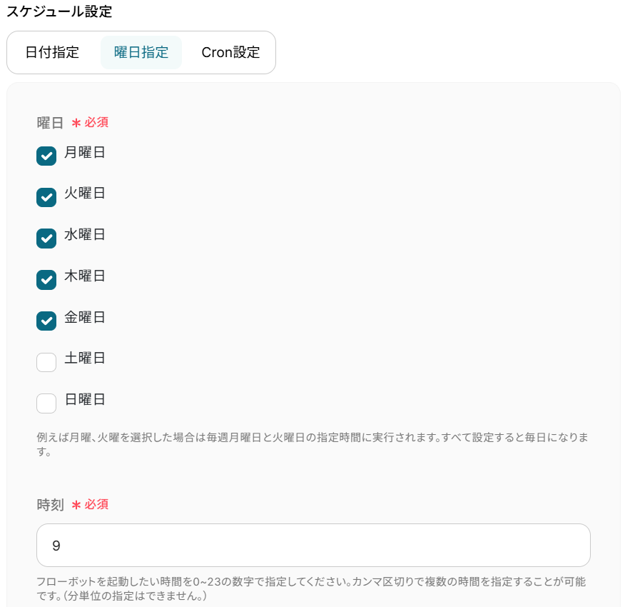 2) 曜日指定…フローボットを起動したい曜日にチェックを入れ、時刻を入力