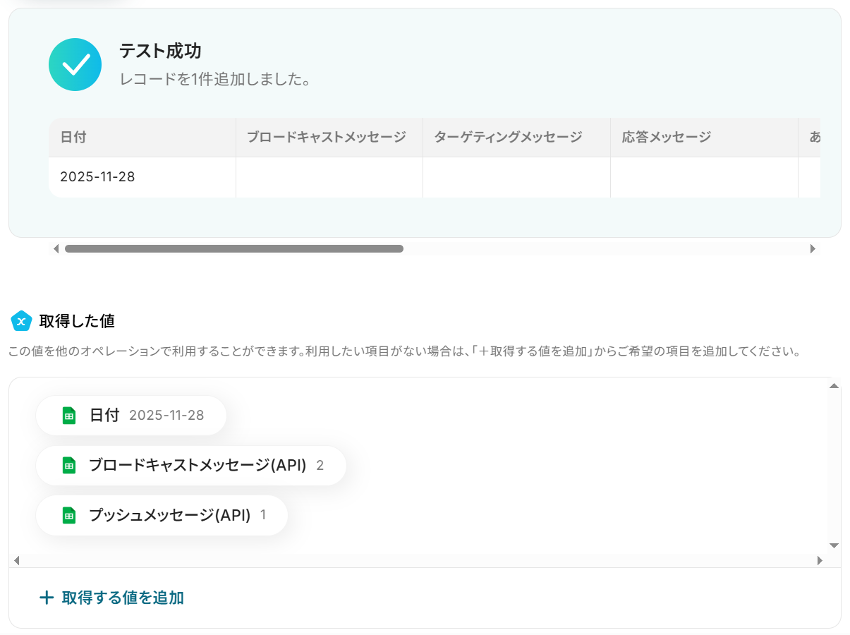 Google スプレッドシートにレコードを追加する際に、どのスプレッドシートのどのシートに記録するかを任意で指定できます。 LINE公式アカウントから取得した配信数などの情報を、Google スプレッドシートの特定の列に変数として埋め込むことが可能です。 実行日など、任意の固定値を合わせて記録するよう設定することもでき、管理しやすいフォーマットに合わせたカスタマイズが行えます。 ■注意事項