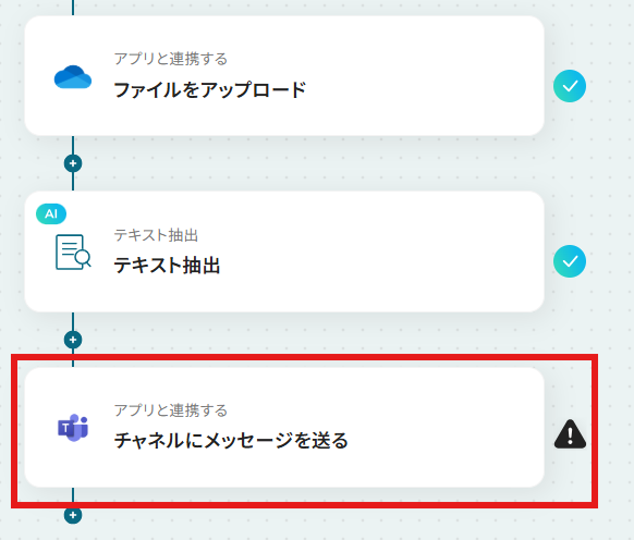 Microsoft Teamsでメッセージを送るアクションでは、通知先のチャネルを任意で設定してください。 AIのテキスト抽出では、ファイル添付に必須の情報以外にも、メッセージで使用したい情報をメール本文などから抽出するよう自由にカスタマイズ可能です。 通知メッセージの本文は、固定のテキストだけでなく、トリガーで受信したメールの件名や送信者などや抽出した情報を動的に埋め込むことも可能です。 ※「トリガー」:フロー起動のきっかけとなるアクション、「オペレーション」:トリガー起動後、フロー内で処理を行うアクション