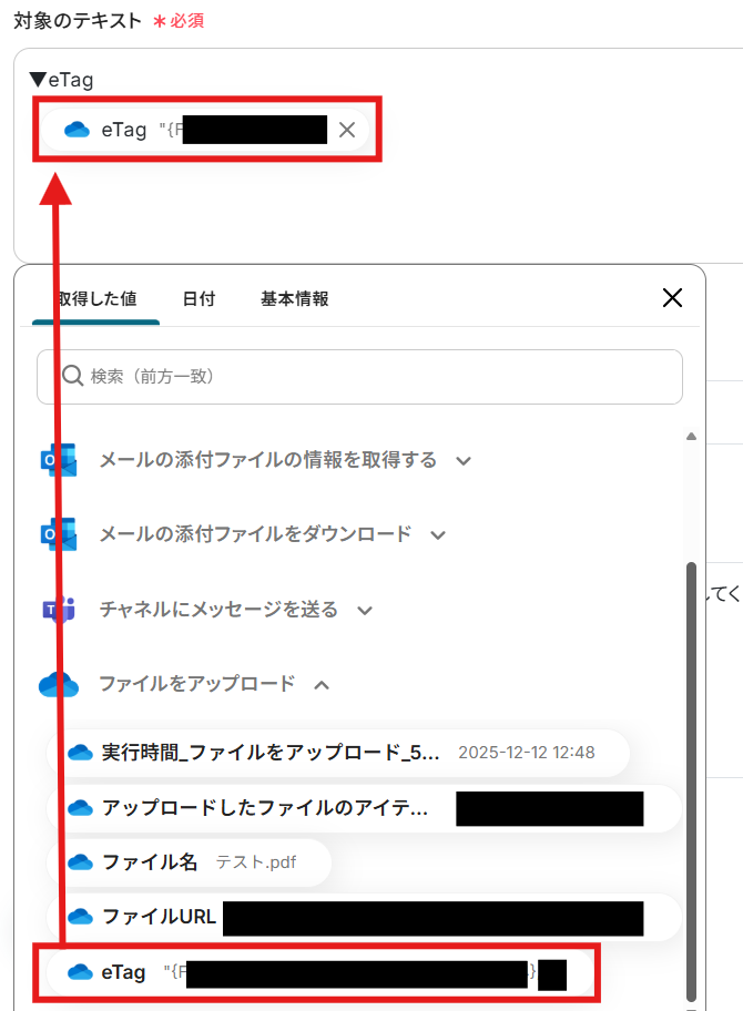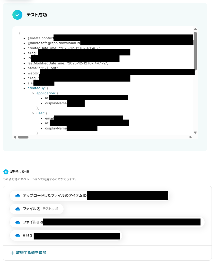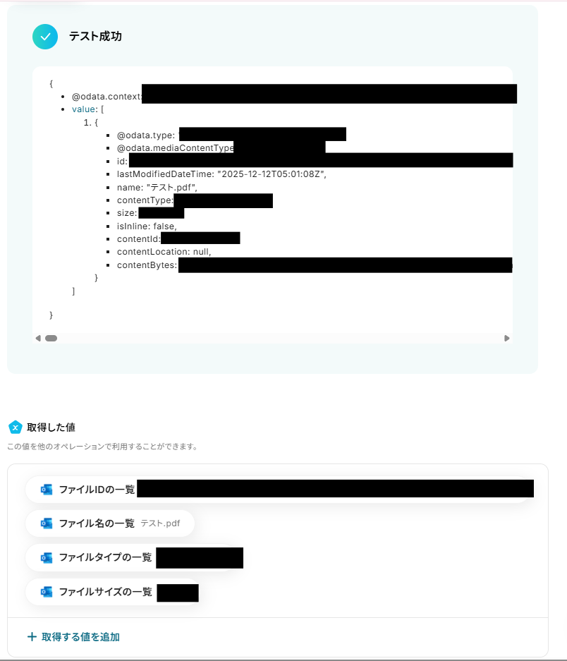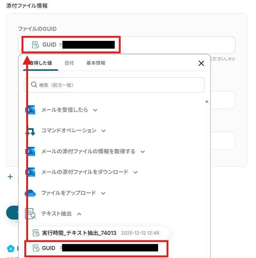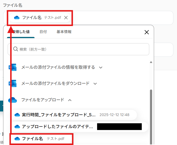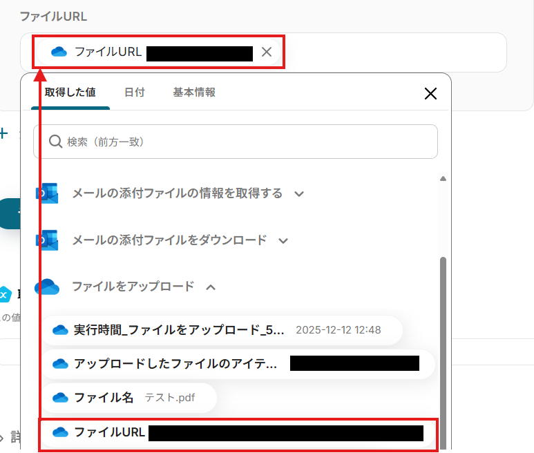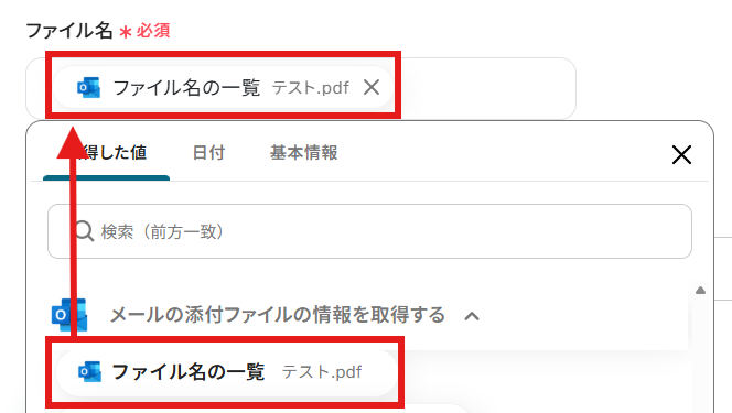 「添付ファイル情報」をそれぞれ「取得した値」から設定しましょう。