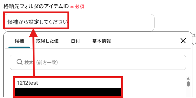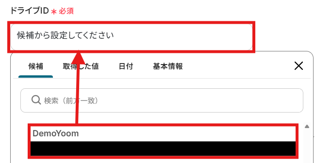 「ドライブID」と「格納先フォルダのアイテムID」を候補から選択しましょう。