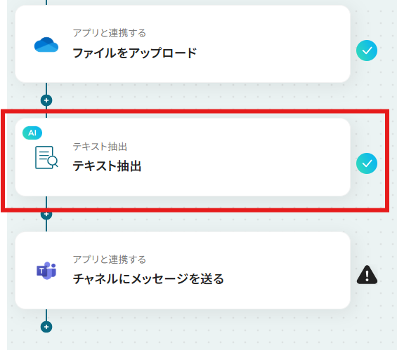 はじめに、Outlook、OneDrive、Microsoft TeamsをYoomと連携します。 次に、トリガーでOutlookを選択し、「メールを受信したら」というアクションを設定します。 次に、オペレーションで分岐機能を設定し、メールに添付ファイルがある場合のみ後続の処理が進むようにします。 添付ファイルがある場合、Outlookの「メールの添付ファイルの情報を取得する」「メールの添付ファイルをダウンロード」アクションを順に設定します。 次に、ダウンロードしたファイルをOneDriveにアップロードします。 続いて、AIのテキスト抽出オペレーションを設定し、 Microsoft Teamsのファイル添付に必要な情報を抽出します。 最後に、Microsoft Teamsの「チャネルにメッセージを送る」アクションを設定し、アップロードしたファイルを指定のチャネルに共有します。 ■このワークフローのカスタムポイント