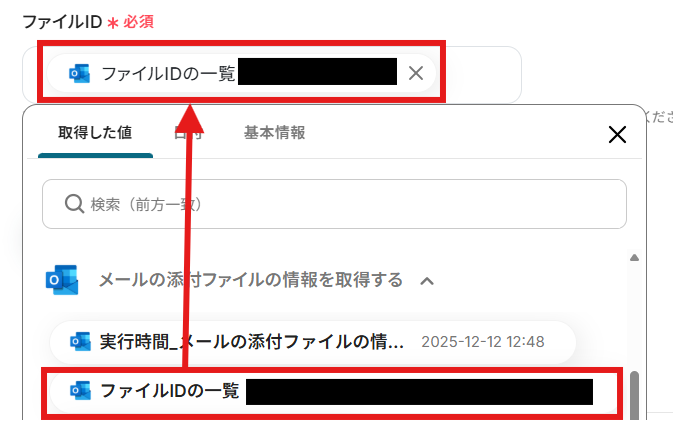 「メールID」と「ファイルID」を「取得した値」から設定しましょう。