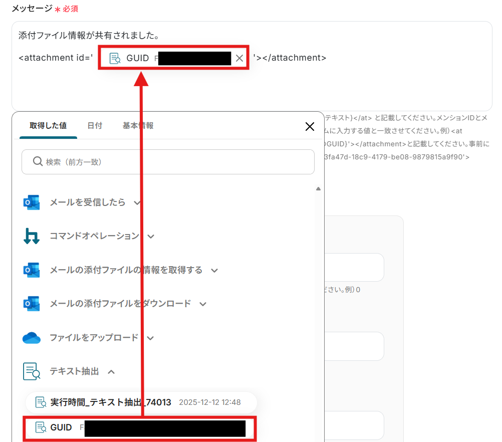 「メッセージ」を設定しましょう。 今回はファイルを添付するので、注釈にある【ファイルの添付】を参考にしてくださいね。 例として「取得した値」と固定のテキストを用いて以下のように設定しました!