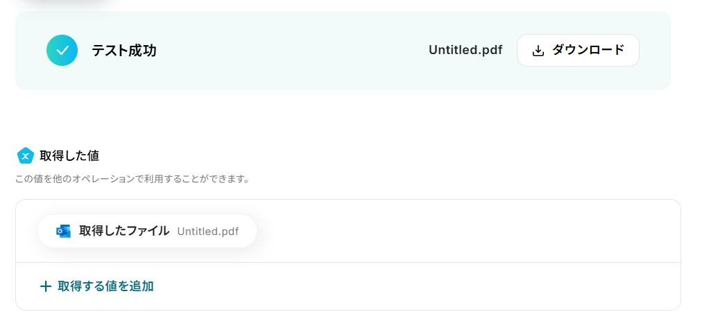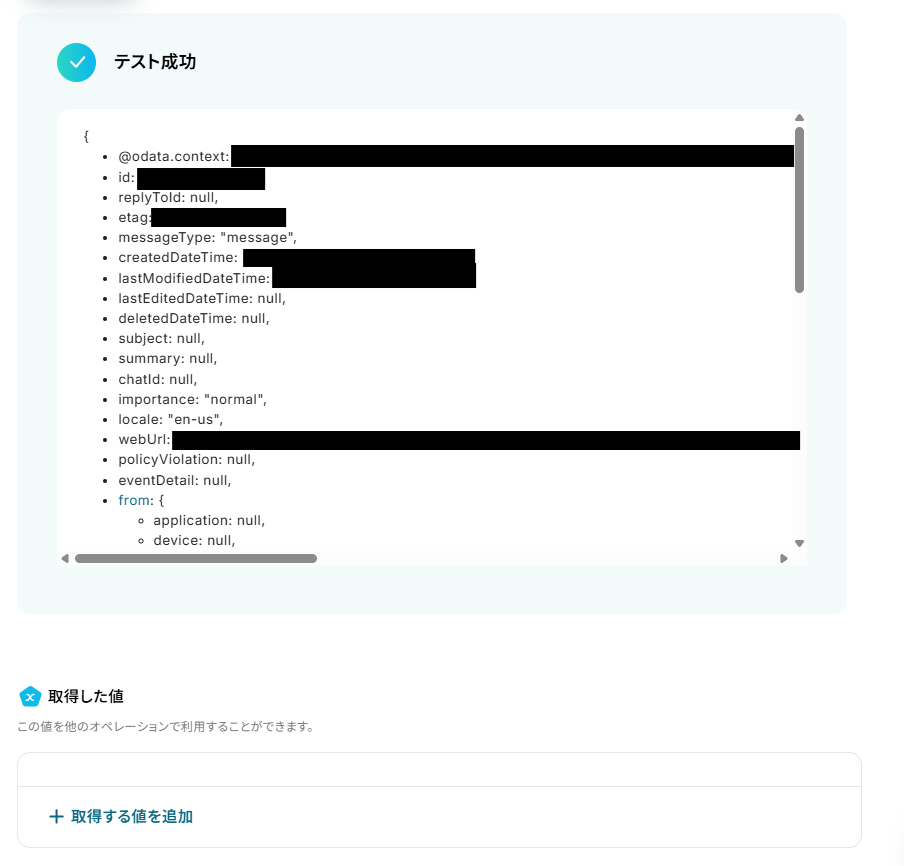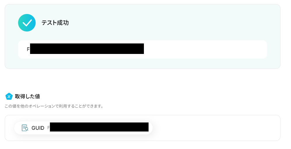 設定できたら「テスト」を行いましょう。 テストに成功すると「取得した値」に反映されます。詳しくは以下をご覧ください。