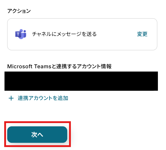 「アクション」はテンプレート通りのままでOKです! 「Microsoft Teamsと連携するアカウント情報」を確認し、「次へ」をクリックして進んでください。