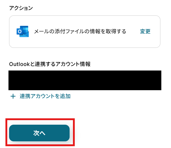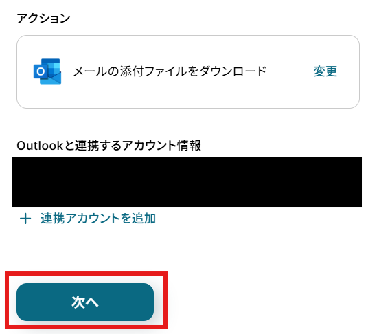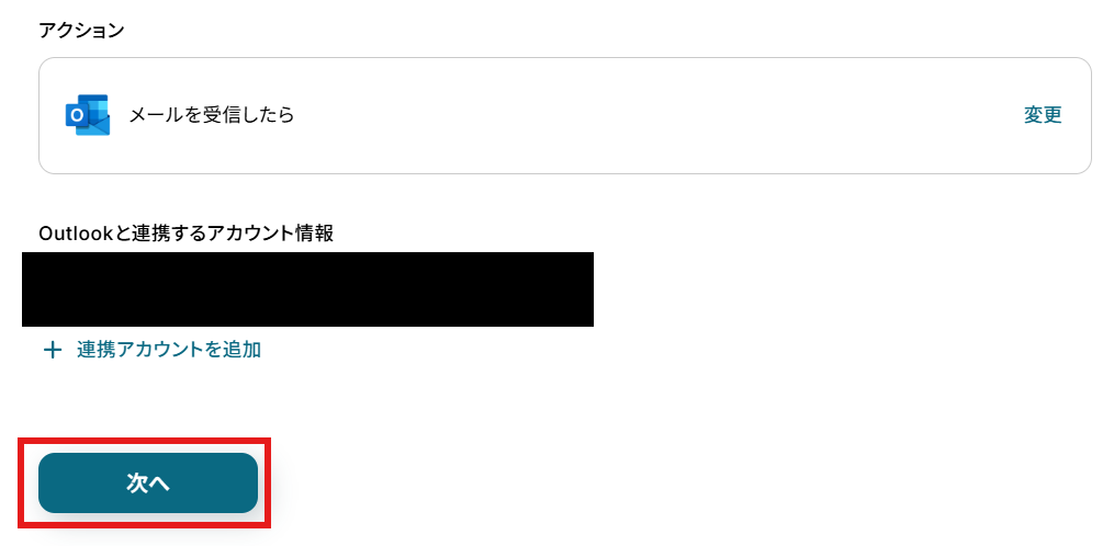 「アクション」はテンプレート通りのままでOKです! 「Outlookと連携するアカウント情報」を確認し、「次へ」をクリックして進んでください。