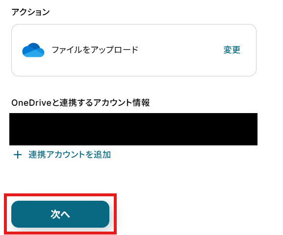 「アクション」はテンプレート通りのままでOKです! 「OneDriveと連携するアカウント情報」を確認し、「次へ」をクリックして進んでください。