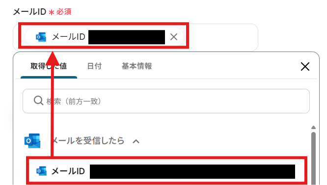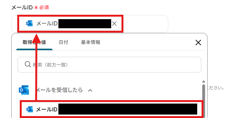 「メールID」を「取得した値」から設定しましょう。 取得した値は変数となります。固定値ではないため、トリガーが実行されるたびに取得した情報を反映できます。