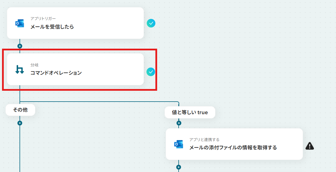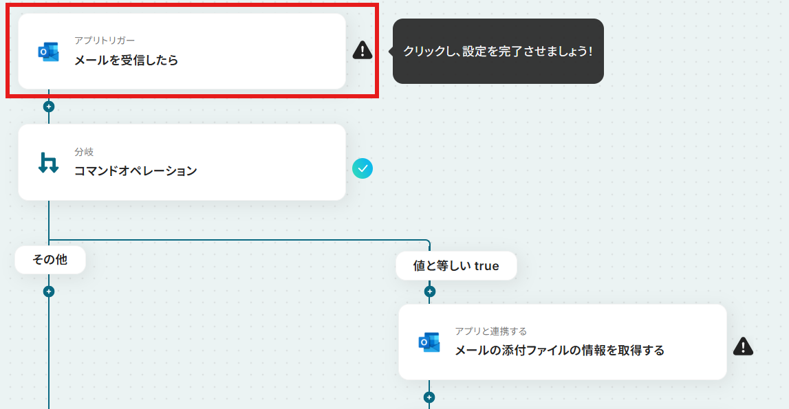 今回はOutlookで受信したメールにファイルが添付されているか否かで分岐させたいので、デフォルトで以下の画像のように設定されています。 確認して「完了」を選択しましょう。