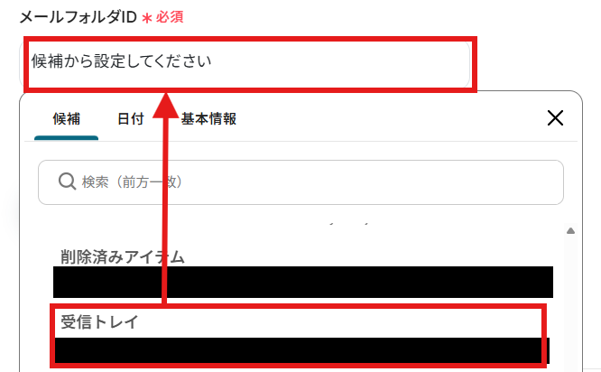 「メールフォルダID」を候補から選択します。 ここで設定したフォルダにメールが届いたらフローボットが起動します。