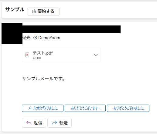 テスト用に、ファイルを添付したメールをOutlookへ送信しましょう。 今回は以下のようなメールを送信しました!