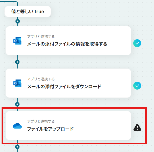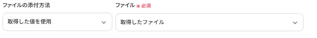 「ファイルの添付方法」が「取得した値を使用」に、「ファイル」が「取得したファイル」に設定されているか確認しましょう。