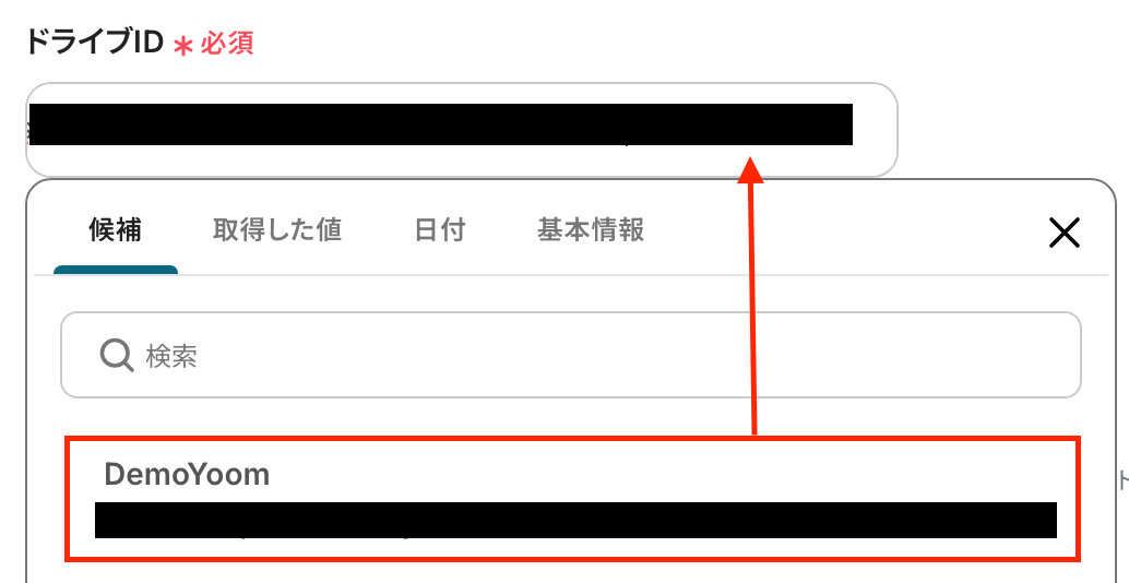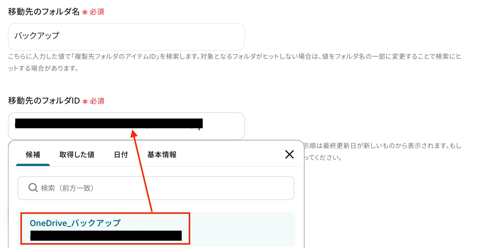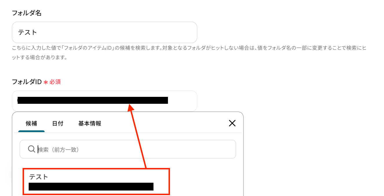 フォルダID:「候補」から対象となるフォルダを選択しましょう。