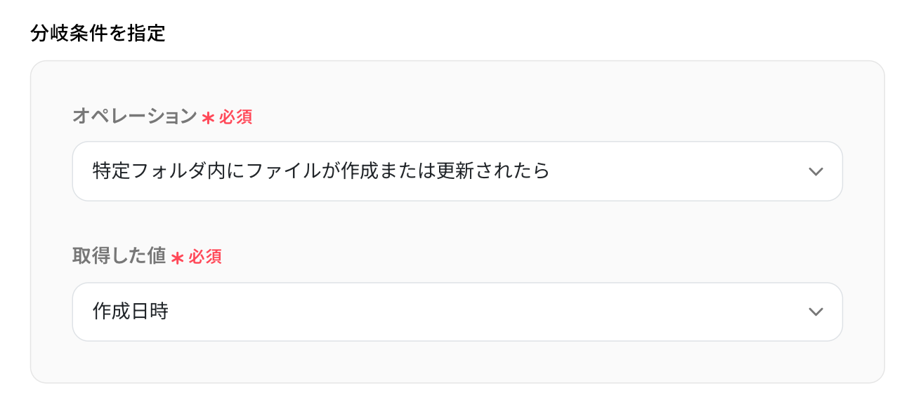 - 次に、オペレーションで分岐機能を設定し、ファイルが追加された場合のみ後続の処理が実行されるようにします