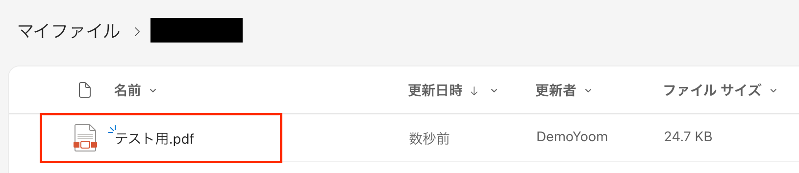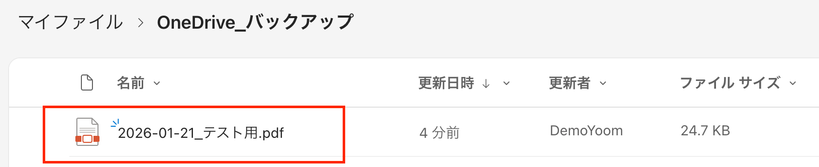 ここで、OneDriveの画面に移動し、特定のフォルダにテスト用のファイルを作成・更新してください。