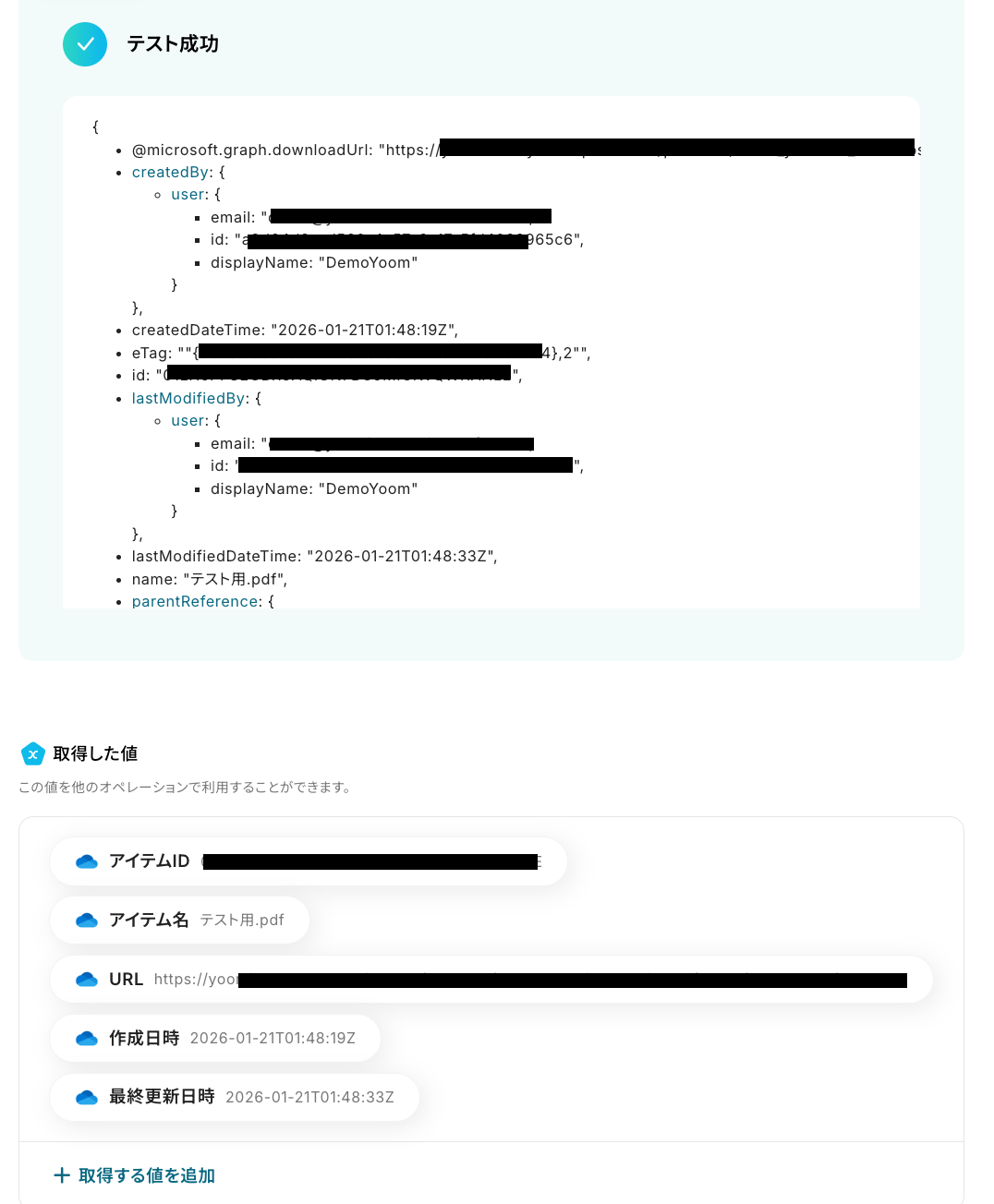トリガーやオペレーション設定時に、「テスト」を実行して取得した値のことを指します。
