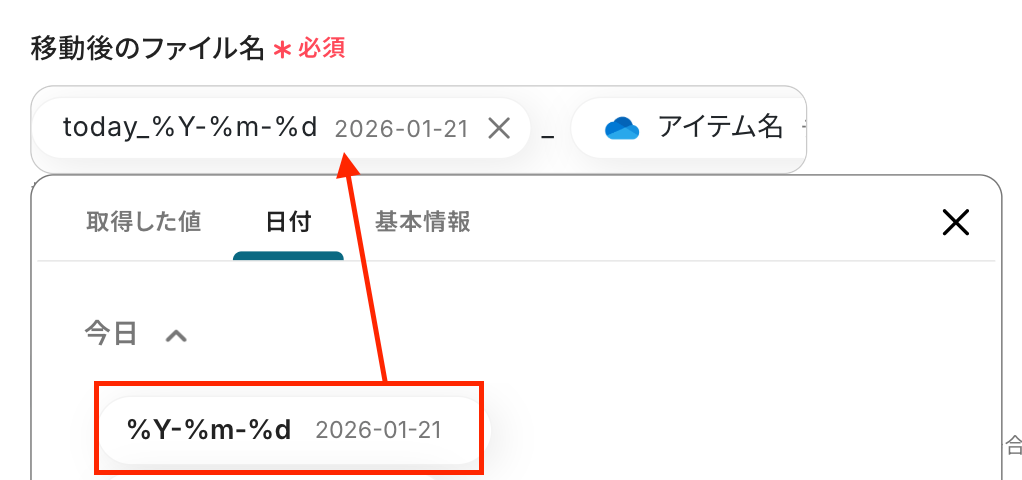 - 同オペレーションで設定する新しいファイル名は、フローの実行日時などの動的な値や、任意のテキストを組み合わせて自由にカスタマイズが可能です