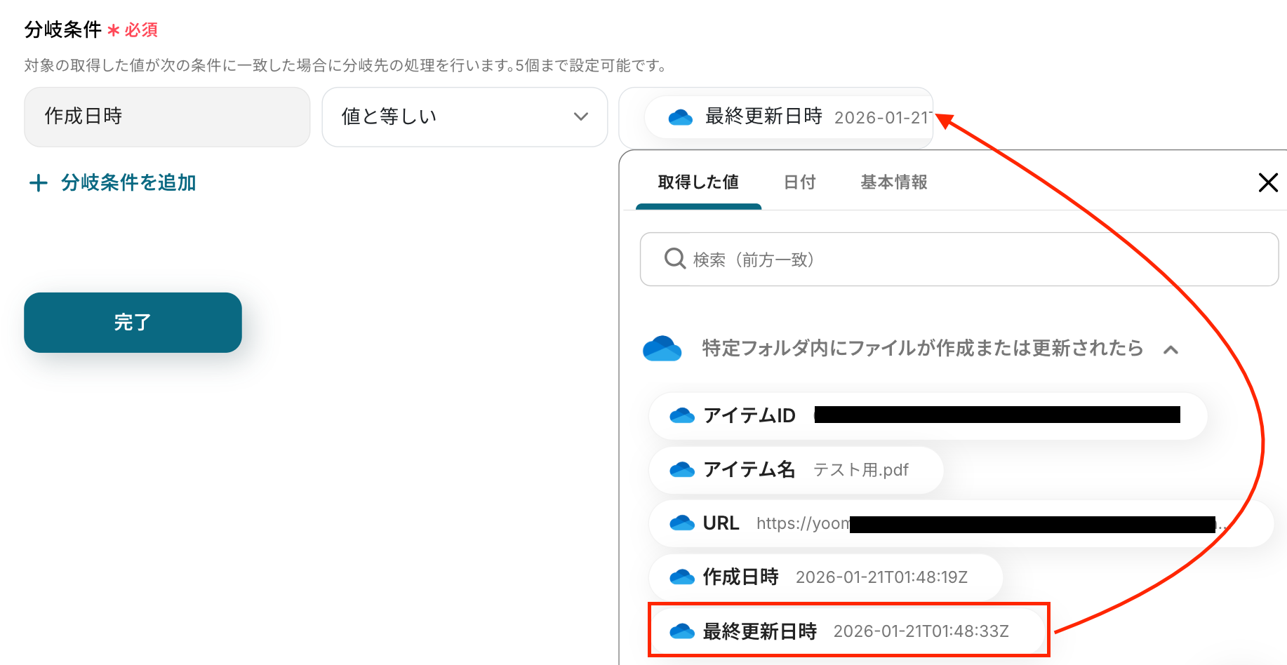 「取得した値」は、先ほどのステップで取得した「作成日時」を設定しましょう!