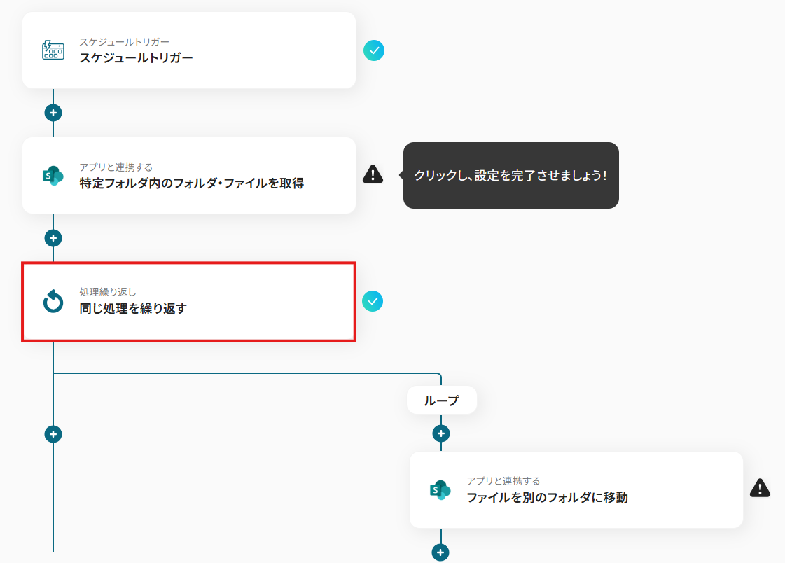 ここでは、繰り返しでファイルをMicrosoft SharePointの別フォルダに移動を行うための設定を行います。
