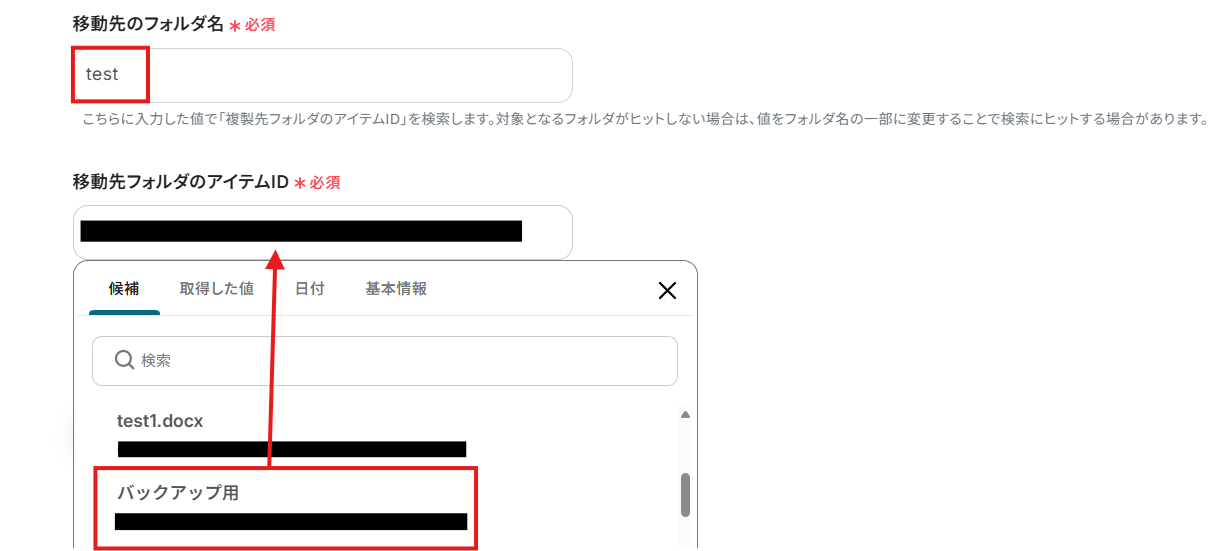 「移動先のフォルダ名」を入力してください。こちらに入力した値で「複製先フォルダのアイテムID」を検索します。 「移動先フォルダのアイテムID」は、入力欄をクリックして表示される候補から選択してください。