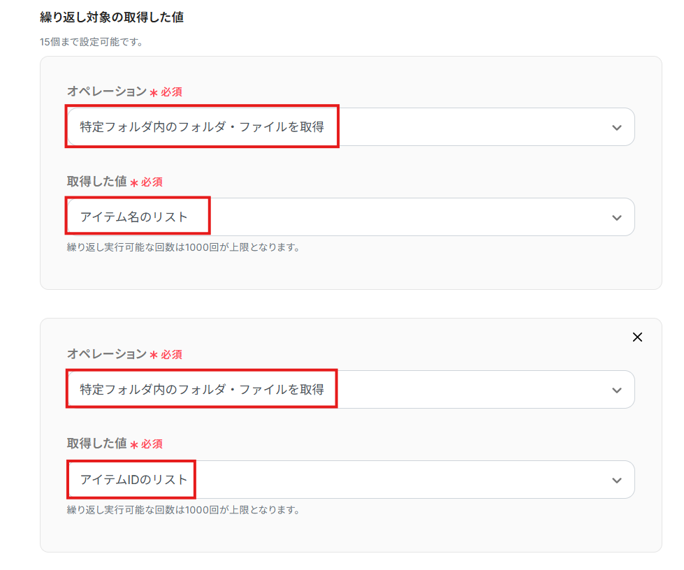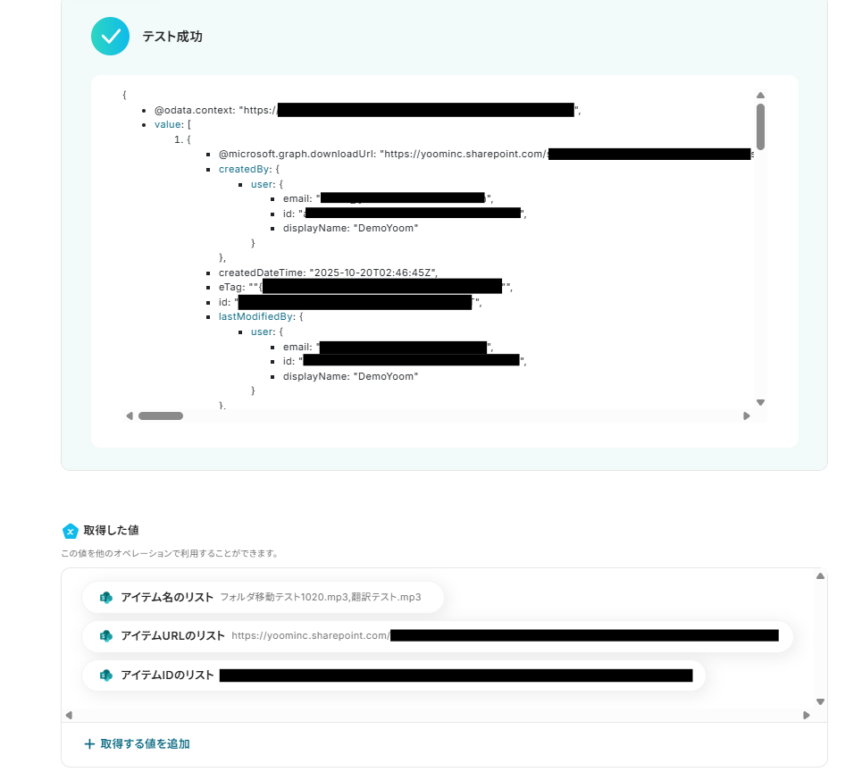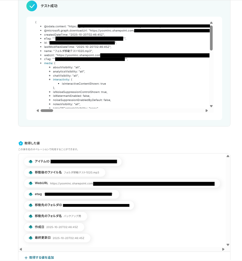 Microsoft SharePointから取得する情報を、「繰り返し対象の取得した値」に設定します。 下図のように、取得した情報で、別フォルダ移動に使用する項目を、全て「取得した値」欄に設定してください。 ※「+取得した値を追加」をクリックすると設定欄が追加されます。