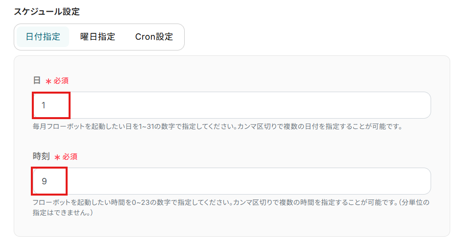 2.スケジュールトリガーの「実行時間の指定」画面から、スケジュール設定を行います。