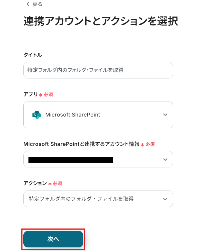 ステップ4:Microsoft SharePointのフォルダ・ファイル取得設定