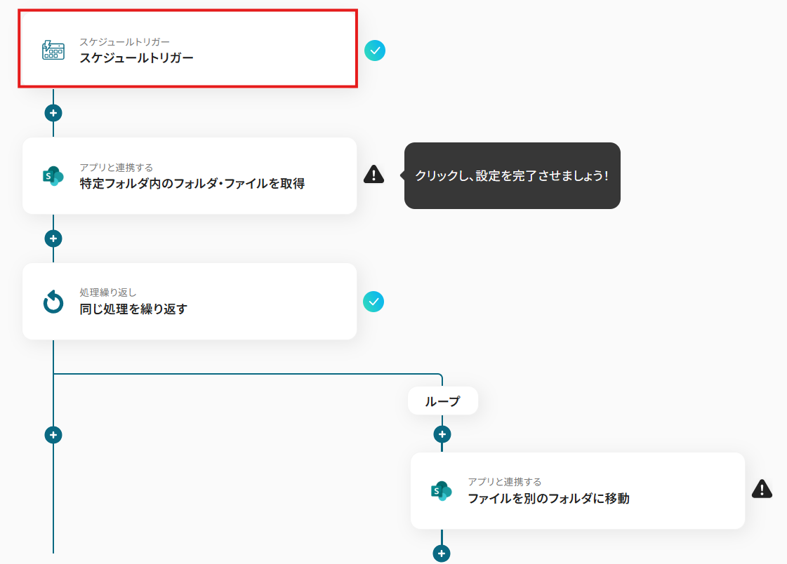 毎月や毎週など、設定したスケジュールをトリガーにして、Microsoft SharePoint上のファイルを指定したフォルダへ自動で移動させることができます。
