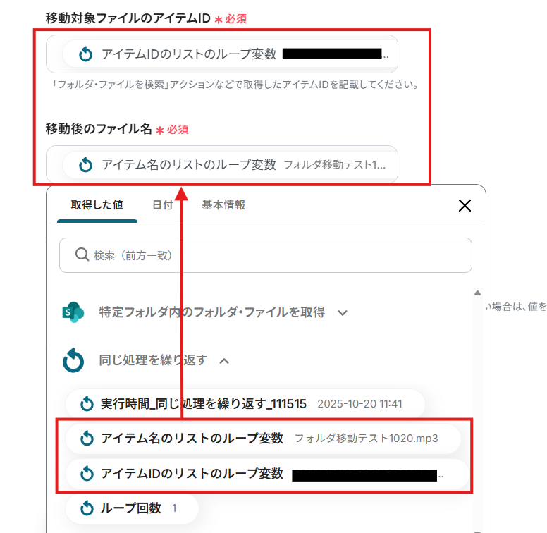 「移動対象ファイルのアイテムID」「移動後のファイル名」は、入力欄をクリックして表示される取得した値から選択してください。 取得した値を活用することで、固定値ではなく、トリガーが実行されるたびに最新の情報が反映できます。