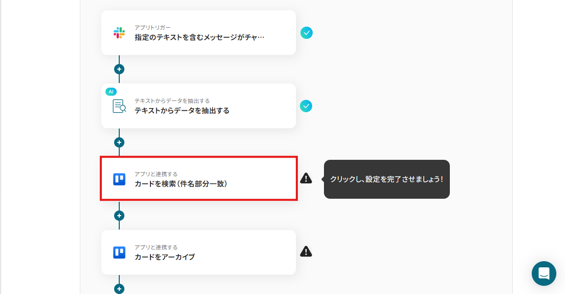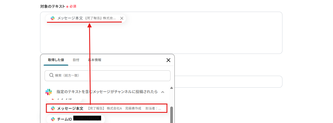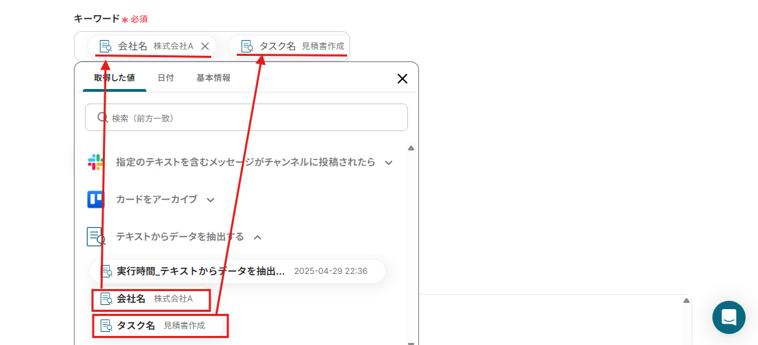 検索したいキーワードは、下記画面のように設定します。 このように設定することで、Slackに送信したメッセージ本文に記載されている「会社名」と「タスク名」を自動でTrello内で検索することができますよ!