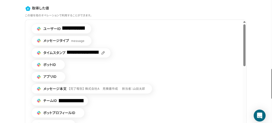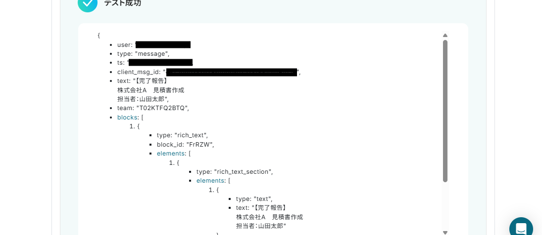 送信できたら、再びYoomのページに戻ります。 テストボタンを押し、テストが成功したら先ほどSlackに送信したメッセージの情報がアウトプットとして取得されます。