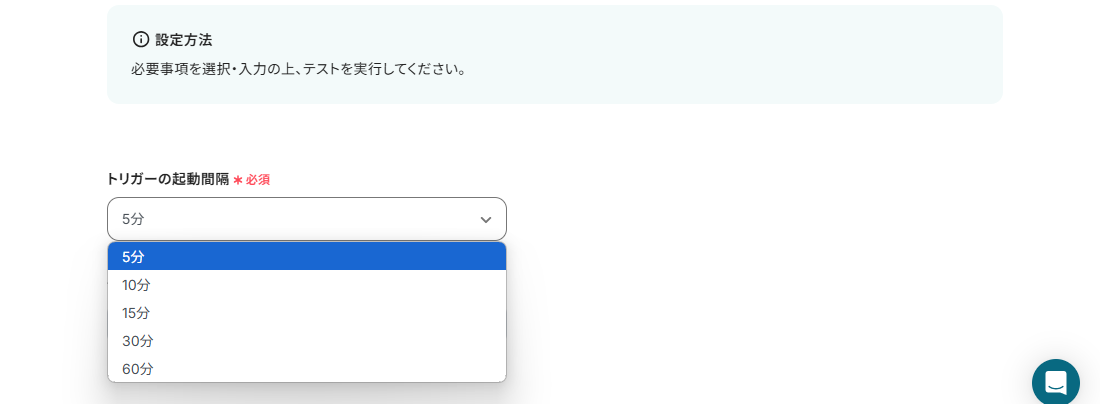 トリガーの起動タイミングは、5分、10分、15分、30分、60分のいずれかで設定できます。 ご利用プラン によって、設定できるトリガーの最短間隔が違うので、その点は要チェックです。 なお、基本的にはそのプランの最短の起動間隔にしてお使いいただくことをおすすめします。