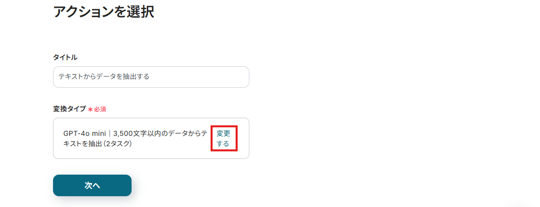 ここでは、テキストからデータを抽出する際に使用するGPTの種類と、最大文字数を選択できます。 変換タイプの枠内にある「変更する」をクリックしてください。
