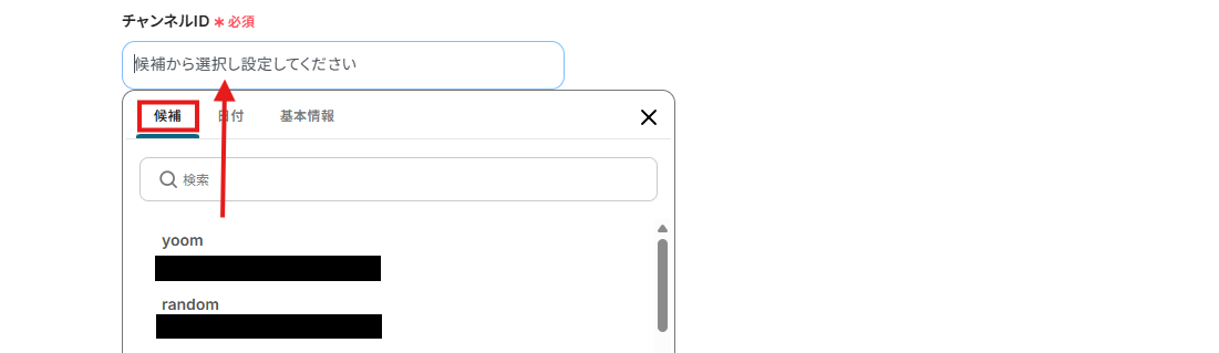 チャンネルIDは、枠内をクリックし表示される候補から選択してください。