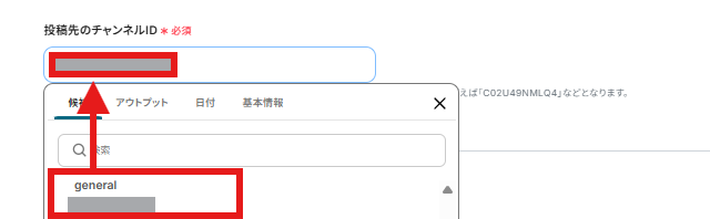 投稿先のチャンネルIDは以下の画像の様に、入力項目の下に表示される候補から選択しましょう!