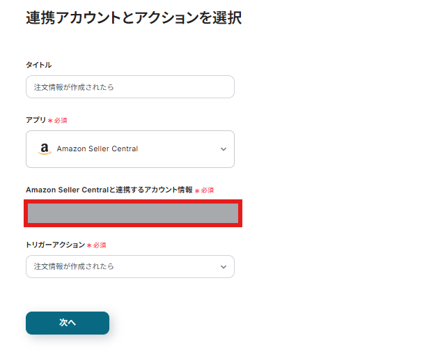 連携アカウントとアクションを選択する画面が表示されるので、今回連携するAmazon Seller Centralのアカウントで間違いないかを確認し「次へ」をクリックします。