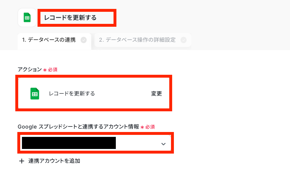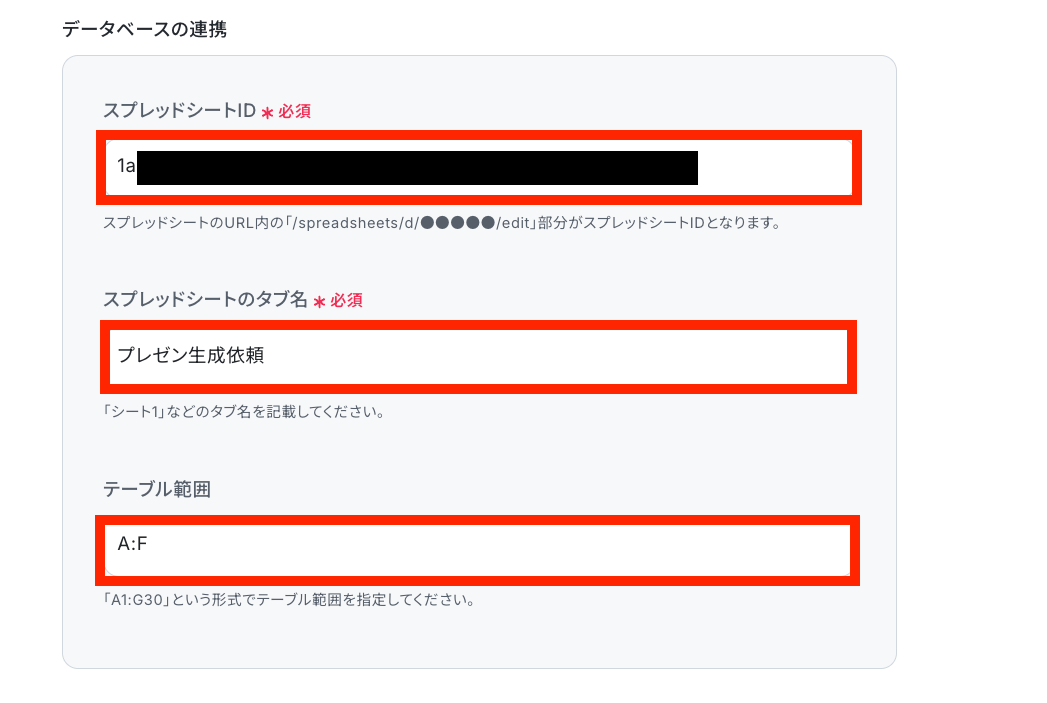 次に「データベースの連携」をします。 「スプレッドシートID」と「スプレッドシートのタブ名」は候補から選択できます。
