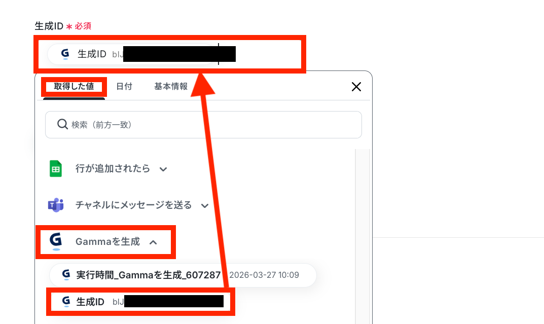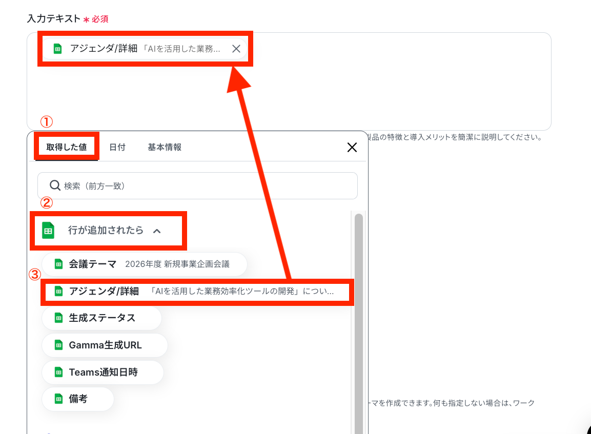 【取得した値を埋め込む方法】 ①入力欄をクリックして「取得した値」を表示 ②「行が追加されたら」をクリック ③「アジェンダ/詳細」などプレゼン資料を生成するのに活用したい項目を選択