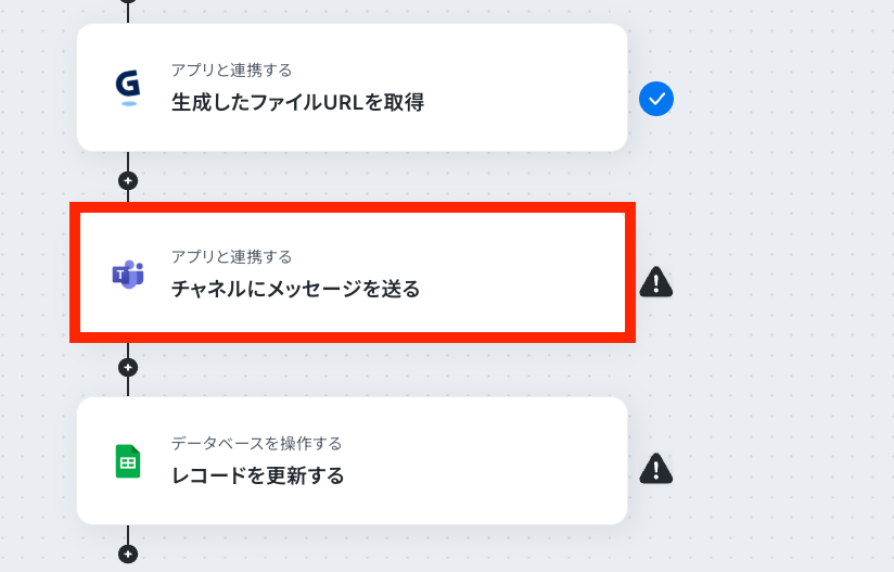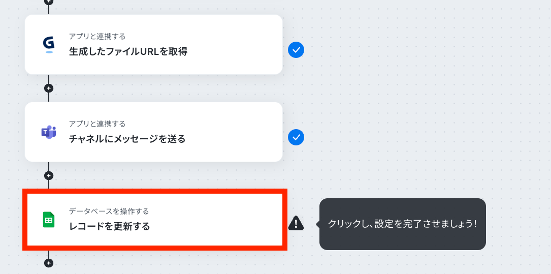 「レコードを更新する」をクリックします。 ※ここのアクションでは、生成URLやMicrosoft Teamsへの通知結果をGoogle スプレッドシートに追加します!