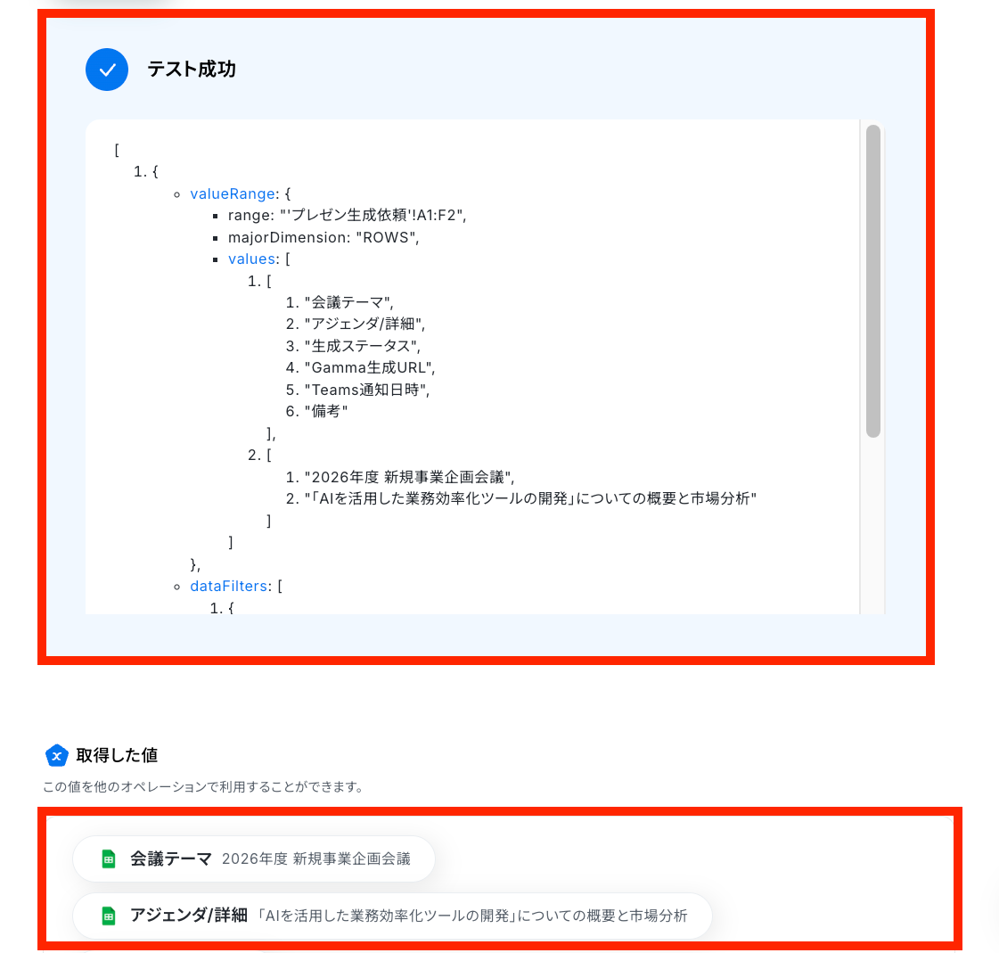 テストに成功すると、Google スプレッドシートのデータが「取得した値(※)」の欄に反映されます。 確認できたら「完了」をクリックしてください。 ※取得した値 とは? トリガーやオペレーション設定時に「テスト」を実行して取得した値のことです。 後続のオペレーション設定時の値として利用でき、フローボットを起動する度に変動した値になります。