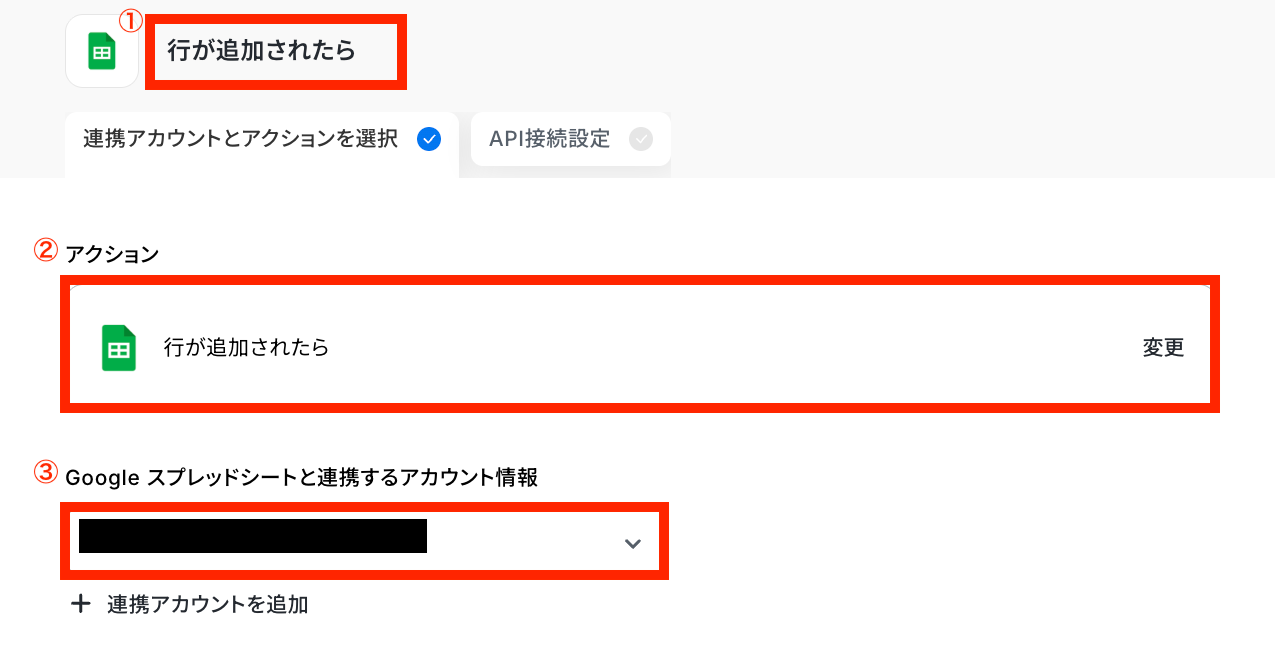 ②アクション:デフォルトで「行が追加されたら」が選択されているのでそのままで問題ありません! ③Google スプレッドシートと連携するアカウント情報:ステップ1で連携したアカウントが表示されていることを確認しましょう。
