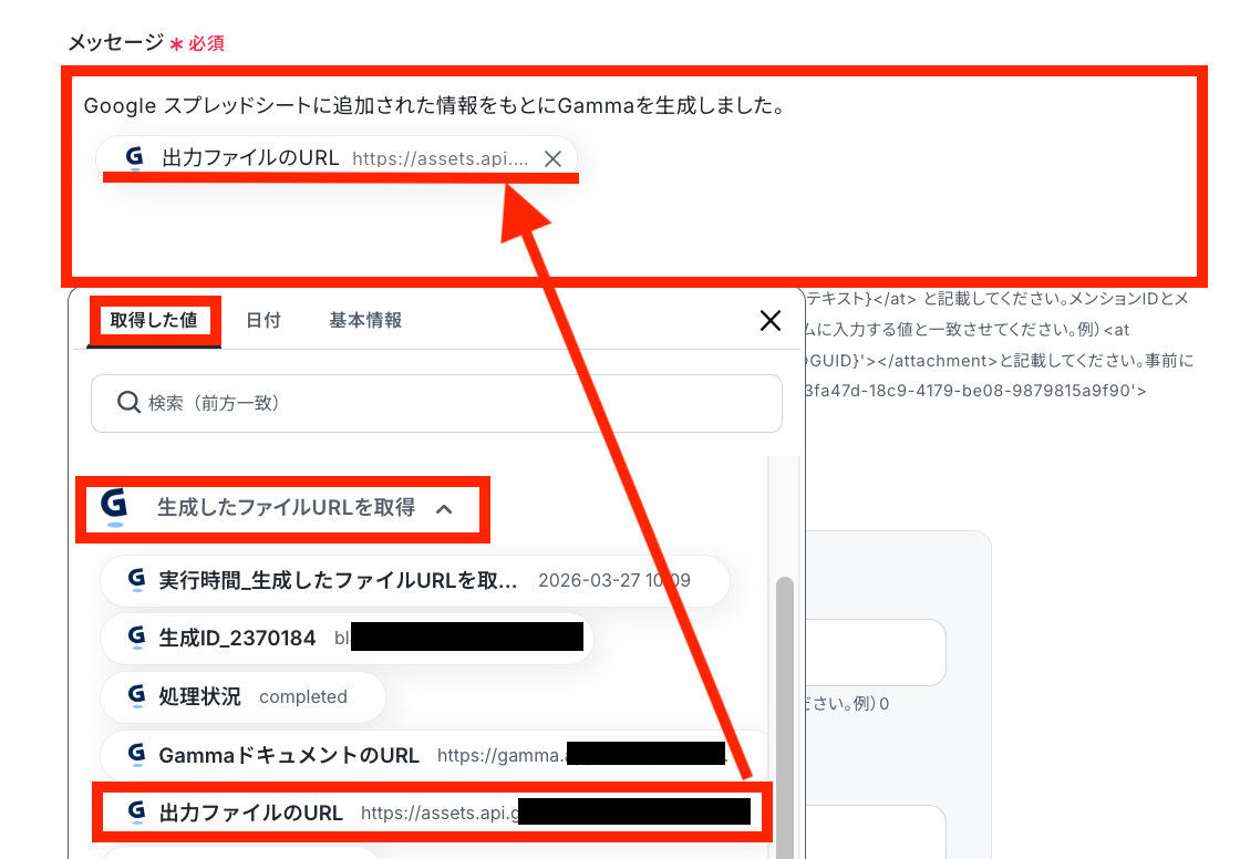 ステップ6:Gammaの生成ファイルURLの取得設定 「生成したファイルURLを取得」をクリックします。