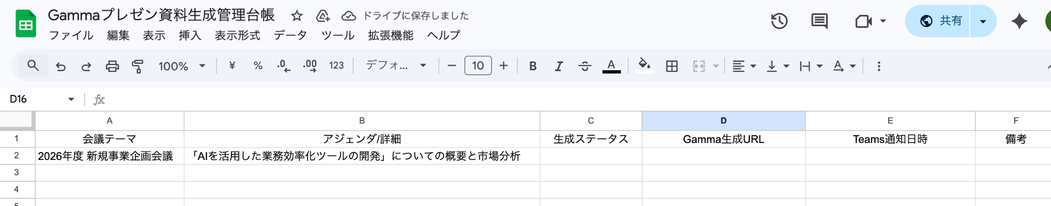 まずはGoogle スプレッドシートを準備します! 今回はテスト用に下の画像のようなシートを準備しています。 (最後に生成URLやMicrosoft Teamsへの通知結果についても記載できるような様式にしているのがポイントです!)