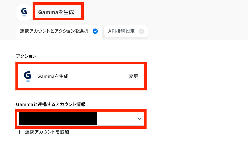 GammaとYoomの連携方法 Gammaを検索すると、新規登録画面が表示されるので「アカウント名」と「API Key」を下の画像の赤枠の説明文を参考に設定してください。 最後に「追加」をクリックしたら連携完了です!