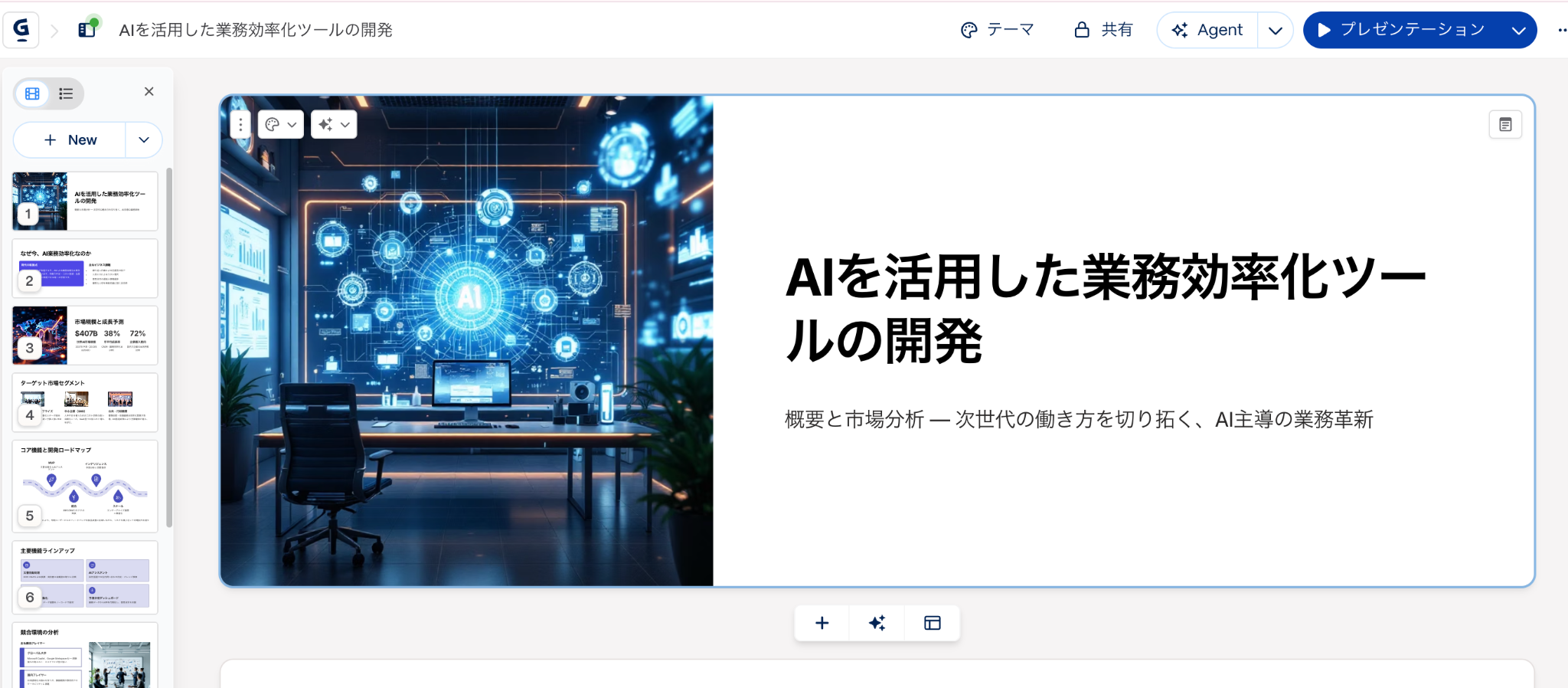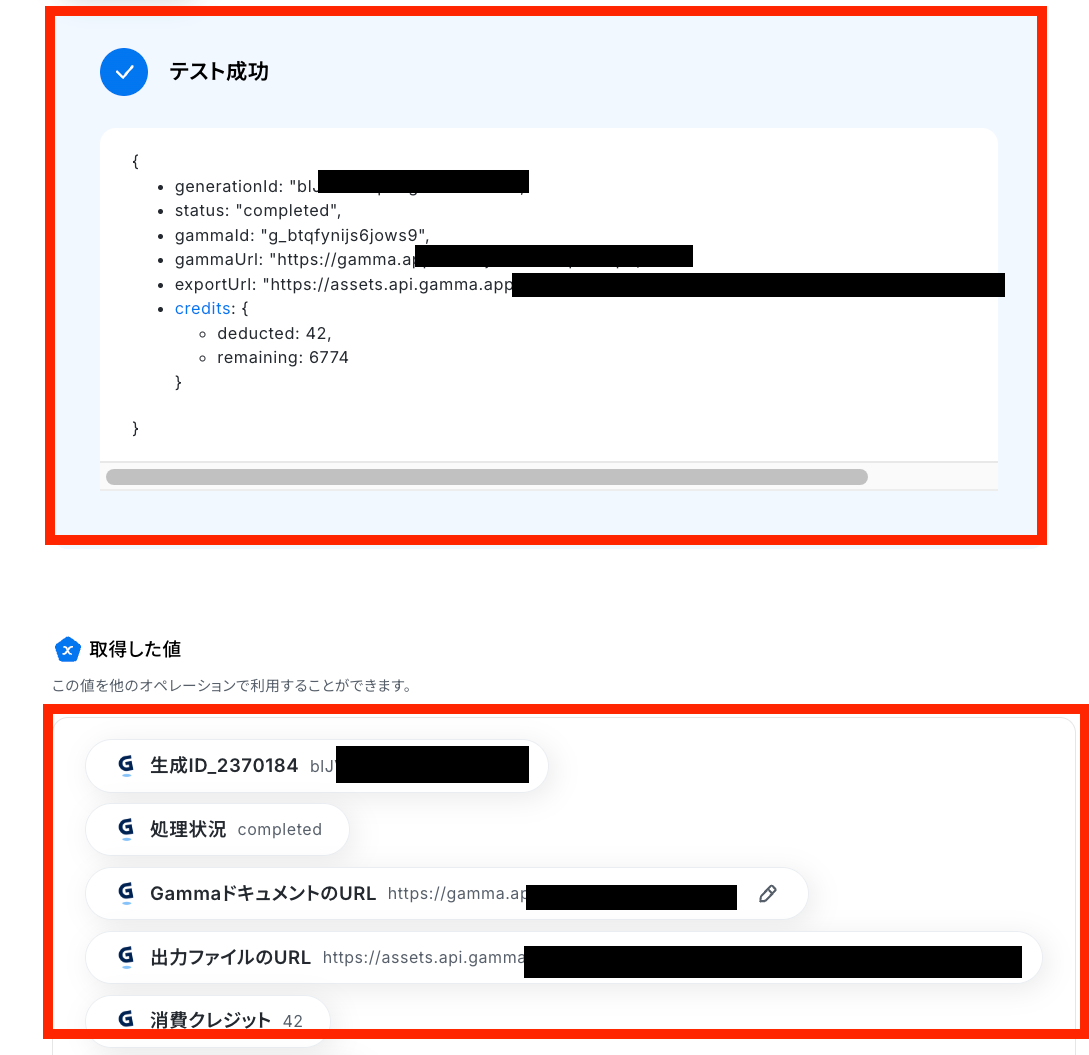 テストに成功したら実際にGammaでプレゼン資料が生成されているか確認しましょう。 確認できたら「完了」をクリックします。