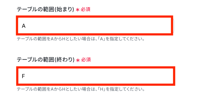 「テーブルの範囲(始まり)」と「テーブルの範囲(終わり)」をGoogle スプレッドシートに合わせて入力します。
