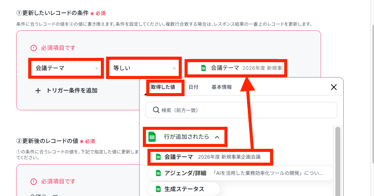 「①更新したいレコードの条件」を取得した値を活用して設定します。